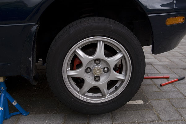 Draai de wielmoeren een slag los. Zoals gewoonlijk veilig werken. Gebuik een stevige krik en zet de auto op bokjes/assteunen.